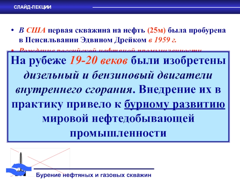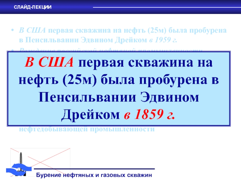 В США первая скважина на нефть (25м) была пробурена в Пенсильвании Эдвином Дрейком в 1859 г.