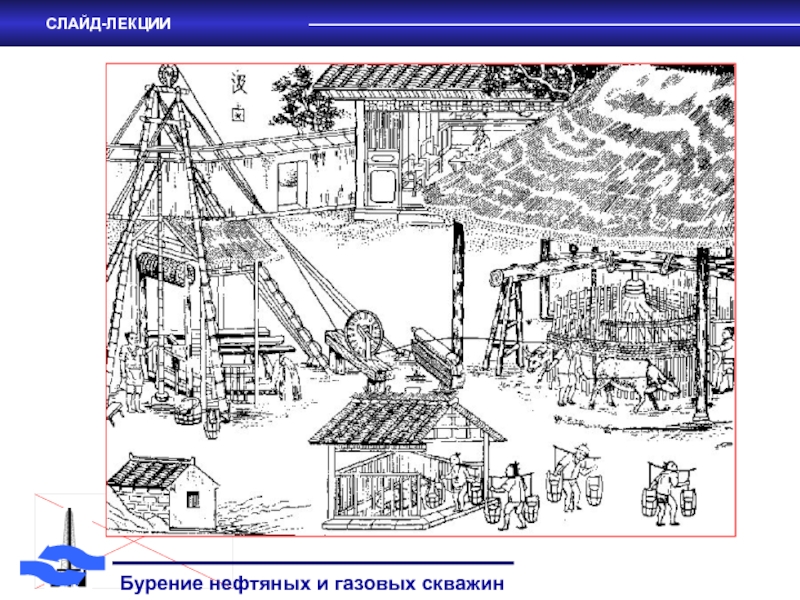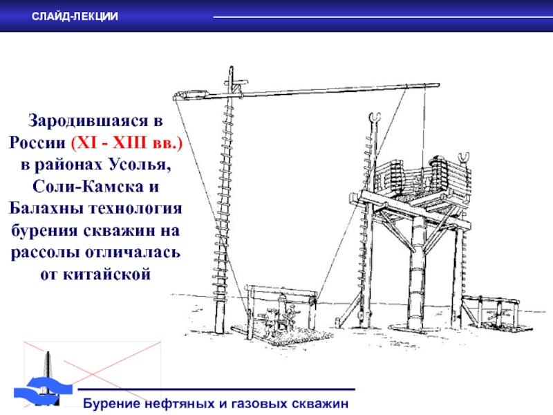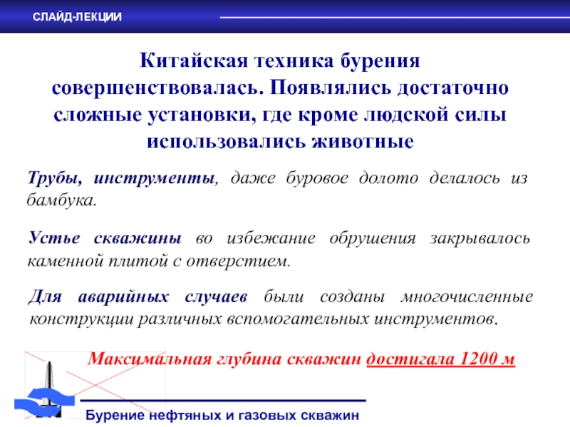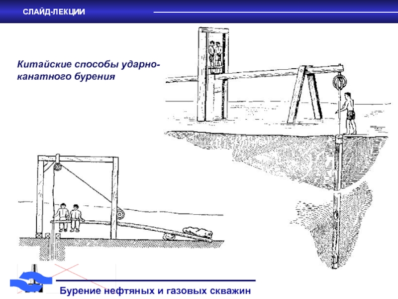 Отличие китайского способа заключается в том, что скважины бурились без вращения, инструмент для разрушения породы углублялся за счет удара. Подвешивался он на канате.