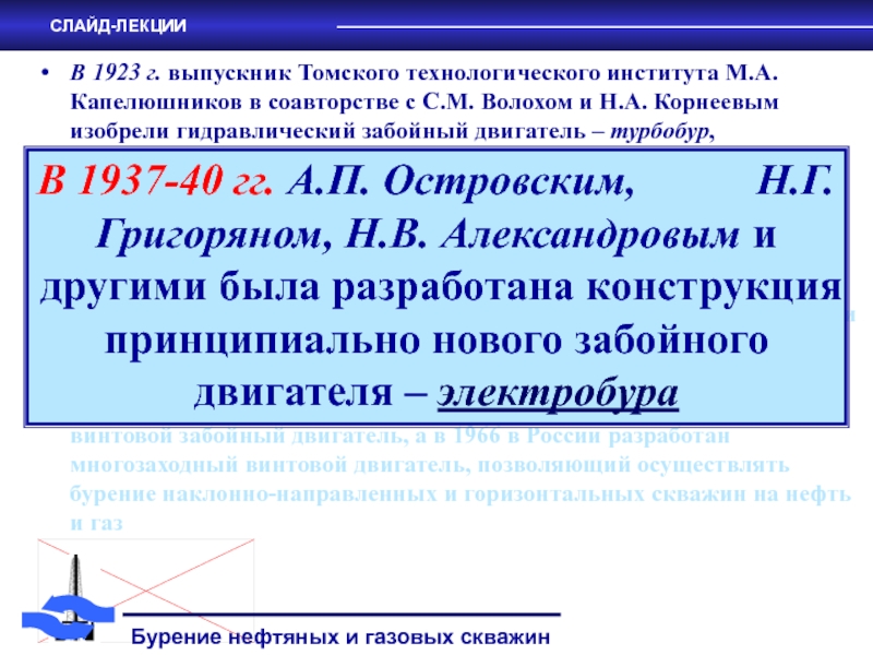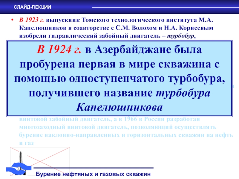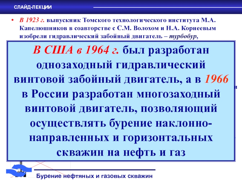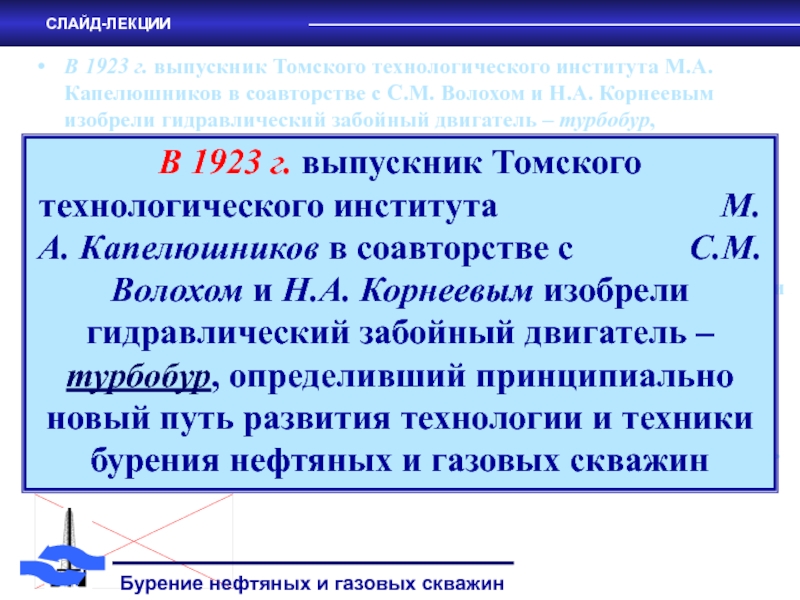 В 1923 г. выпускник Томского технологического института             М.А. Капелюшников в соавторстве с       С.М. Волохом и Н.А. Корнеевым изобрели гидравлический забойный двигатель – турбобур, определивший принципиально новый путь развития технологии и техники бурения нефтяных и газовых скважин