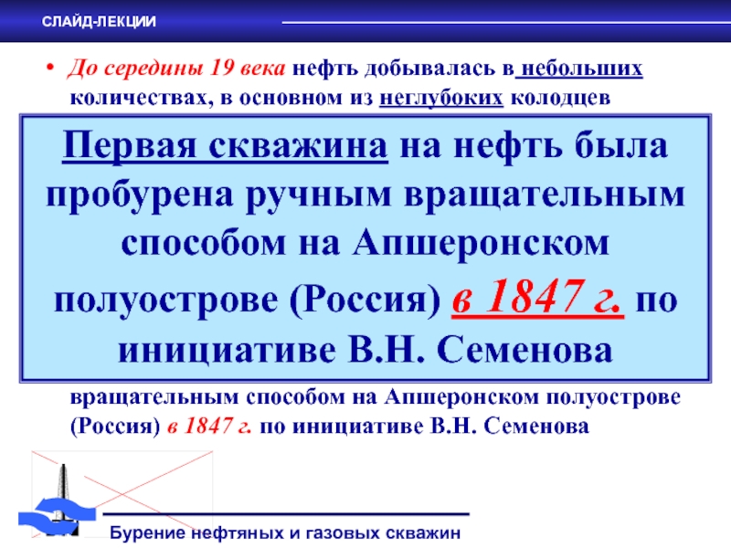 Первая скважина на нефть была пробурена ручным вращательным способом на Апшеронском полуострове (Россия) в 1847 г. по инициативе В.Н. Семенова