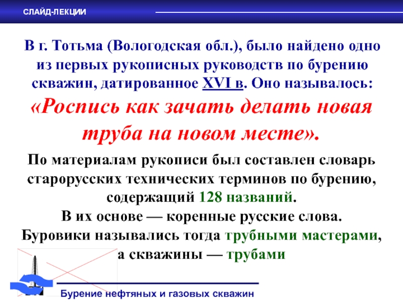 По материалам рукописи был составлен словарь старорусских технических терминов по бурению, содержащий 128 названий.                      В их основе — коренные русские слова.       Буровики назывались тогда трубными мастерами, а скважины — трубами