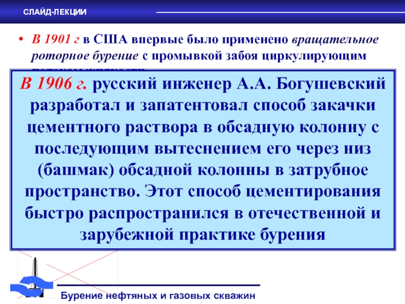 В 1906 г. русский инженер А.А. Богушевский разработал и запатентовал способ закачки цементного раствора в обсадную колонну с последующим вытеснением его через низ (башмак) обсадной колонны в затрубное пространство. Этот способ цементирования быстро распространился в отечественной и зарубежной практике бурения
