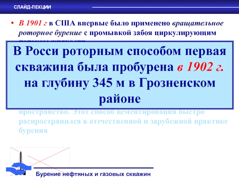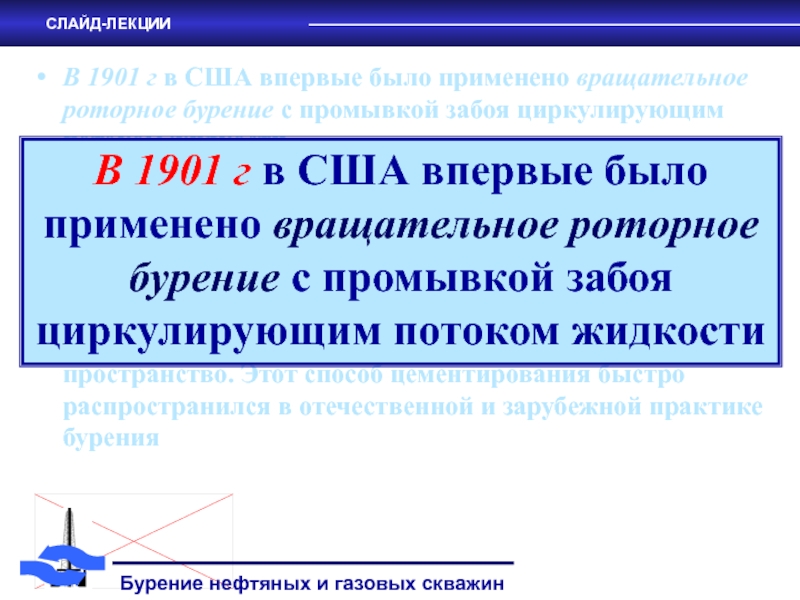 В 1901 г в США впервые было применено вращательное роторное бурение с промывкой забоя циркулирующим потоком жидкости