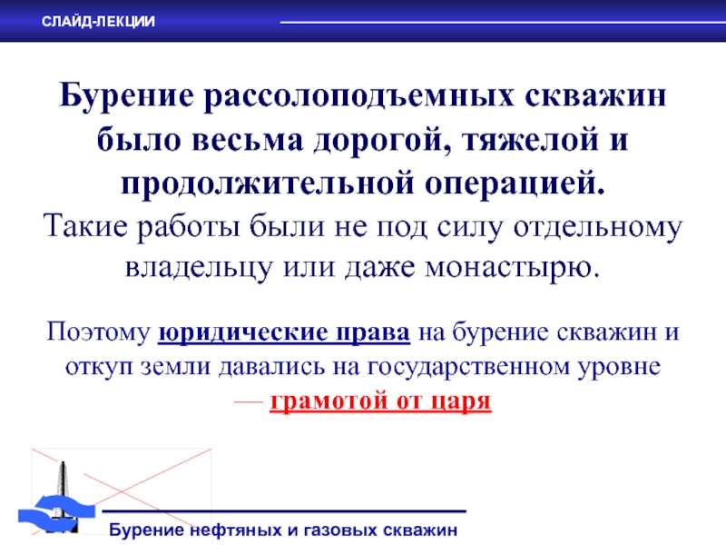 Поэтому юридические права на бурение скважин и откуп земли давались на государственном уровне    — грамотой от царя