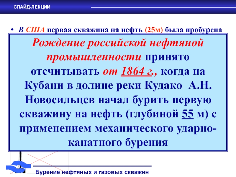 Рождение российской нефтяной промышленности принято отсчитывать от 1864 г., когда на Кубани в долине реки Кудако А.Н. Новосильцев начал бурить первую скважину на нефть (глубиной 55 м) с применением механического ударно-канатного бурения