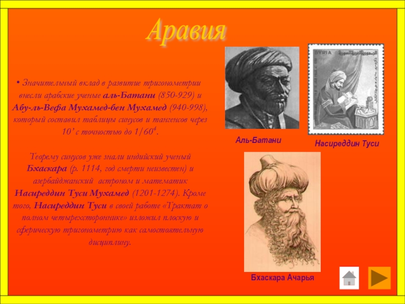 Арабскими математиками в IX веке это слово было заменено на арабское слово джайб (выпуклость). При переводе арабских математических текстов в веке оно было заменено латинским синус (sinus – изгиб, кривизна).