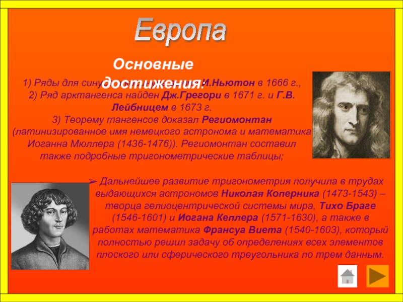 Дальнейшее развитие тригонометрия получила в трудах выдающихся астрономов Николая Коперника (1473-1543) – творца гелиоцентрической системы мира, Тихо Браге (1546-1601) и Иогана Кеплера (1571-1630), а также в работах математика Франсуа Виета (1540-1603), который полностью решил задачу об определениях всех элементов плоского или сферического треугольника по трем данным.