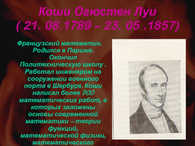 в Париже. Окончил Политехническую школу .Работал инженером на сооружении военного порта в Шербуре. Коши написал более 700 математических работ, в которых заложены основы современной математики – теории функций, математической физики, математического анализа.