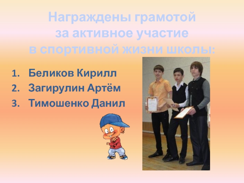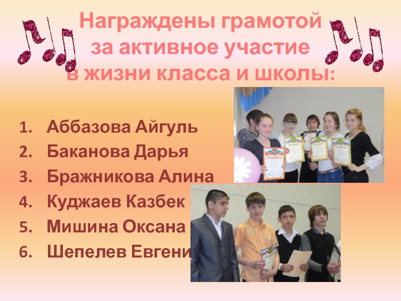 Слайд 4Награждены грамотой за активное участие в жизни класса и школы: