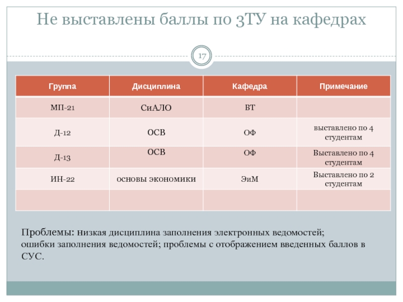 Слайд 17Не выставлены баллы по 3ТУ на кафедрах