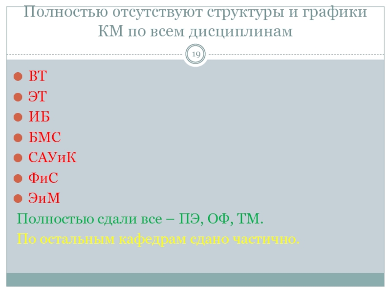 Слайд 19Полностью отсутствуют структуры и графики КМ по всем дисциплинам