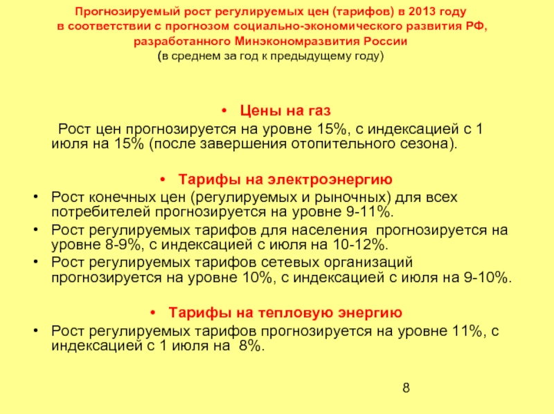 Рост регулируемых тарифов для населения прогнозируется на уровне 8-9%, с индексацией с июля на 10-12%.