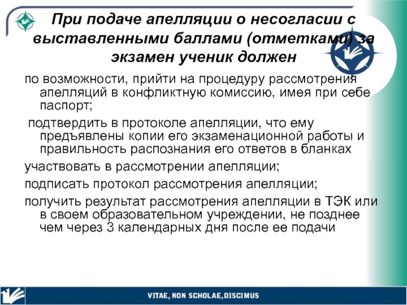 Слайд 23При подаче апелляции о несогласии с выставленными баллами (отметками) за экзамен