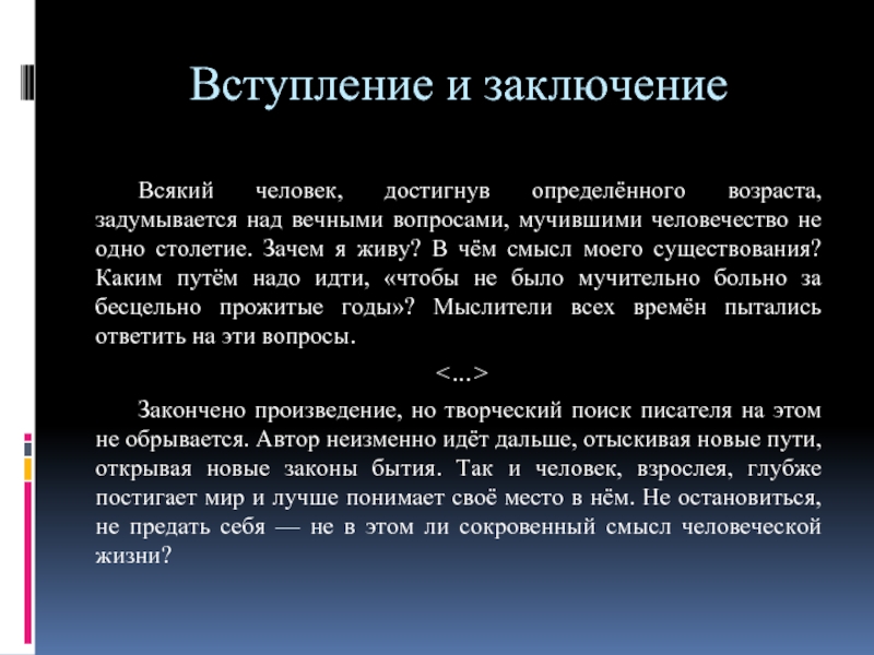 Закончено произведение, но творческий поиск писателя на этом не обрывается. Автор неизменно идёт дальше, отыскивая новые пути, открывая новые законы бытия. Так и человек, взрослея, глубже постигает мир и лучше понимает своё место в нём. Не остановиться, не предать себя — не в этом ли сокровенный смысл человеческой жизни?