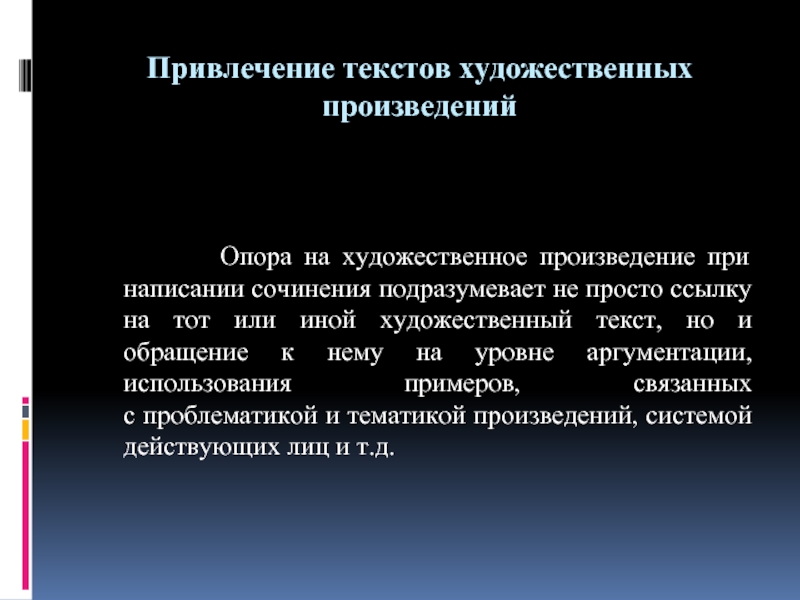 Опора на художественное произведение при написании сочинения подразумевает не просто ссылку на тот или иной художественный текст, но и обращение к нему на уровне аргументации, использования примеров, связанных с проблематикой и тематикой произведений, системой действующих лиц и т.д.