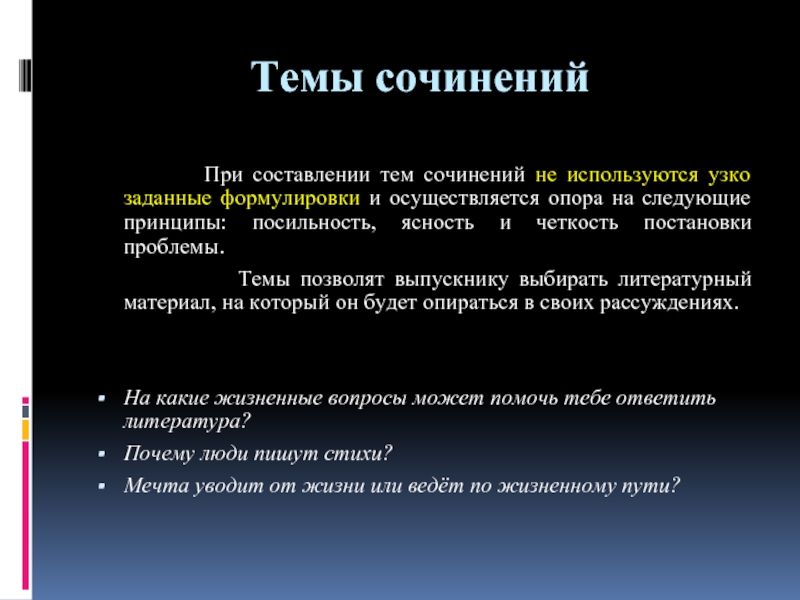 сочинений не используются узко заданные формулировки и осуществляется опора на следующие принципы: посильность, ясность и четкость постановки проблемы.
