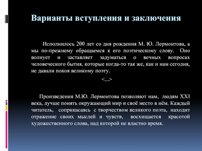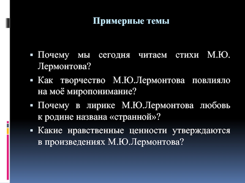 лет со дня рождения М. Ю. Лермонтова, а мы по-прежнему обращаемся к его поэтическому слову. Оно волнует и заставляет задуматься о вечных вопросах человеческого бытия, которые когда-то так же, как и нам сегодня, не давали покоя великому поэту.