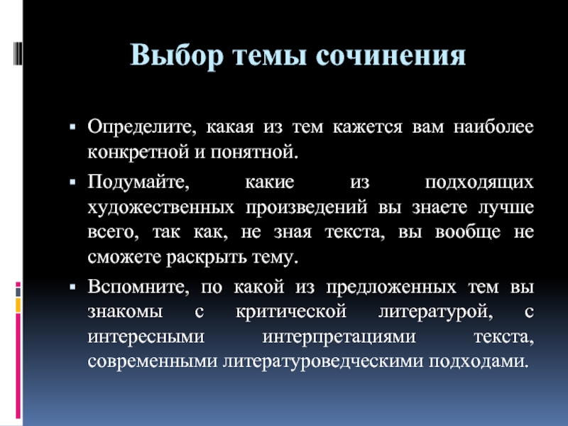 Подумайте, какие из подходящих художественных произведений вы знаете лучше всего, так как, не зная текста, вы вообще не сможете раскрыть тему.