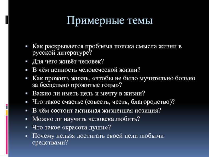 мучившими человечество не одно столетие. Зачем я живу? В чём смысл моего существования? Каким путём надо идти, «чтобы не было мучительно больно за бесцельно прожитые годы»? Мыслители всех времён пытались ответить на эти вопросы.