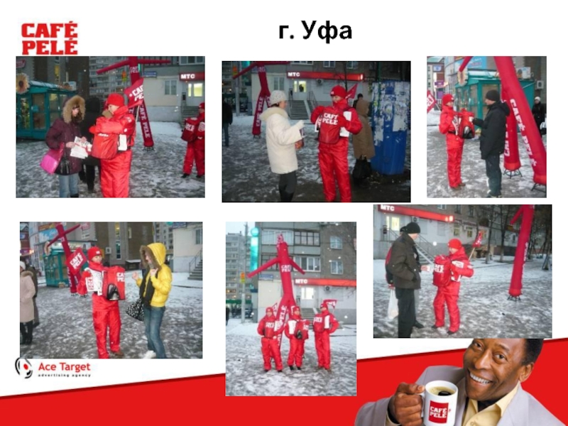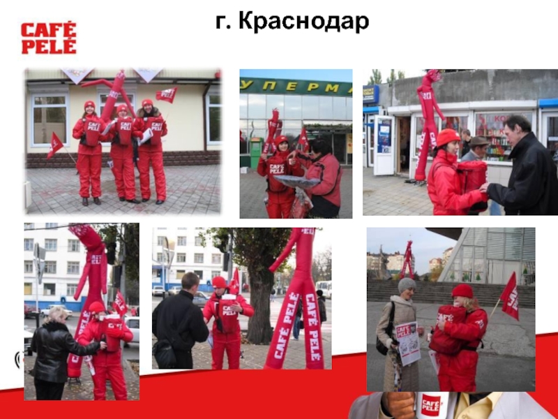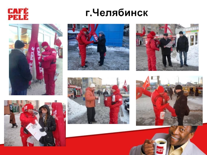 У каждого промоутера в наличие должен быть следующий реквизит: рюкзак-термос, стаканчики, сахар, палочки для размешивания, салфетки. Промоутеры размещаются в разных сторонах площадки, приблизительно в 10-15 м. друг от друга и предлагают потенциальным потребителям попробовать кофе Café Pele (порция 100 гр). После проведения дегустации предлагают потребителю утреннюю газету как напоминание о бренде после дегустации. План 100 дегустаций/день/1 промоутер.