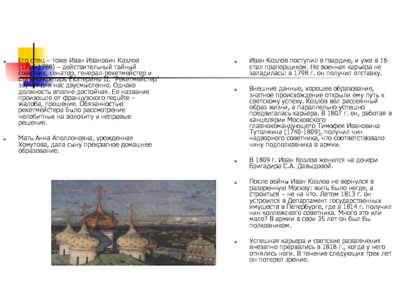 Иван Козлов поступил в гвардию, и уже в 16 стал прапорщиком. Но военная карьера не заладилась: в 1798 г. он получил отставку.