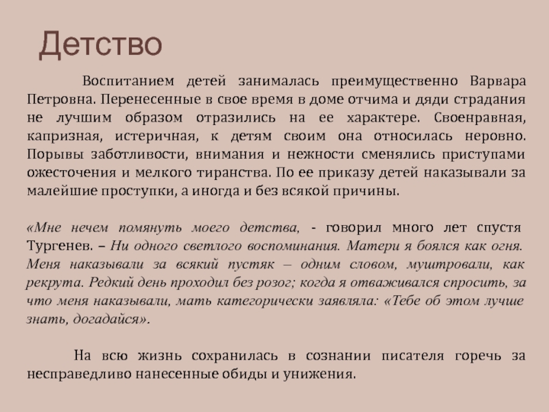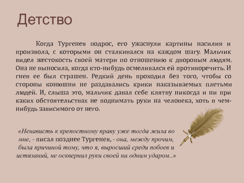 «Ненависть к крепостному праву уже тогда жила во мне, - писал позднее Тургенев, - она, между прочим, была причиной тому, что я, выросший среди побоев и истязаний, не осквернил руки своей ни одним ударом..»