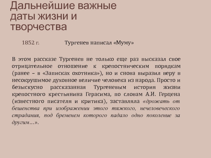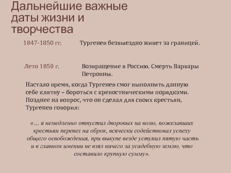 Настало время, когда Тургенев смог выполнить данную себе клятву – бороться с крепостническими порядками. Позднее на вопрос, что он сделал для своих крестьян, Тургенев говорил: