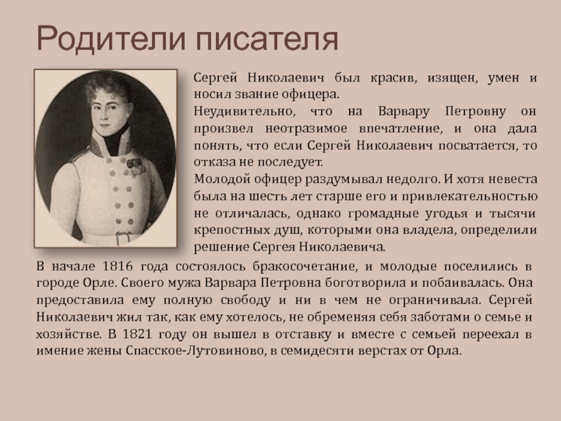 В начале 1816 года состоялось бракосочетание, и молодые поселились в городе Орле. Своего мужа Варвара Петровна боготворила и побаивалась. Она предоставила ему полную свободу и ни в чем не ограничивала. Сергей Николаевич жил так, как ему хотелось, не обременяя себя заботами о семье и хозяйстве. В 1821 году он вышел в отставку и вместе с семьей переехал в имение жены Спасское-Лутовиново, в семидесяти верстах от Орла.