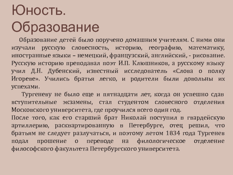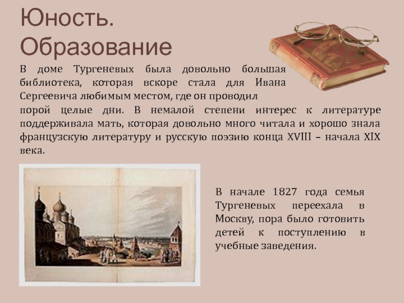 В начале 1827 года семья Тургеневых переехала в Москву, пора было готовить детей к поступлению в учебные заведения.