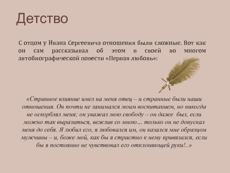 «Странное влияние имел на меня отец – и странные были наши отношения. Он почти не занимался моим воспитанием, но никогда не оскорблял меня; он уважал мою свободу – он даже был, если можно так выразиться, вежлив со мною… только он не допускал меня до себя. Я любил его, я любовался им, он казался мне образцом мужчины – и, боже мой, как бы я страстно к нему привязался, если бы я постоянно не чувствовал его отклоняющей руки!..»