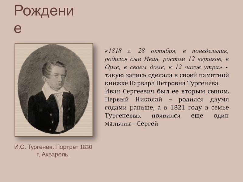И.С. Тургенев. Портрет 1830 г. Акварель.
