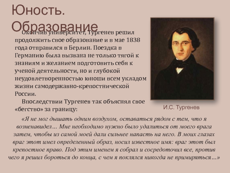 «Я не мог дышать одним воздухом, оставаться рядом с тем, что я возненавидел… Мне необходимо нужно было удалиться от моего врага затем, чтобы из самой моей дали сильнее напасть на него. В моих глазах враг этот имел определенный образ, носил известное имя: враг этот был крепостное право. Под этим именем я собрал и сосредоточил все, против чего я решил бороться до конца, с чем я поклялся никогда не примиряться…»