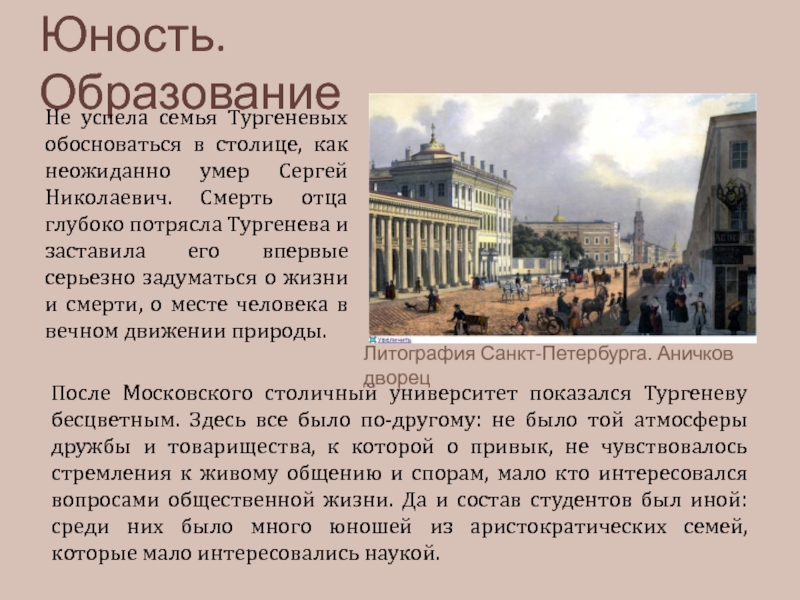После Московского столичный университет показался Тургеневу бесцветным. Здесь все было по-другому: не было той атмосферы дружбы и товарищества, к которой о привык, не чувствовалось стремления к живому общению и спорам, мало кто интересовался вопросами общественной жизни. Да и состав студентов был иной: среди них было много юношей из аристократических семей, которые мало интересовались наукой.