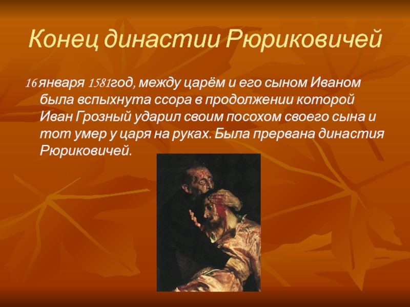 была вспыхнута ссора в продолжении которой Иван Грозный ударил своим посохом своего сына и тот умер у царя на руках. Была прервана династия Рюриковичей.