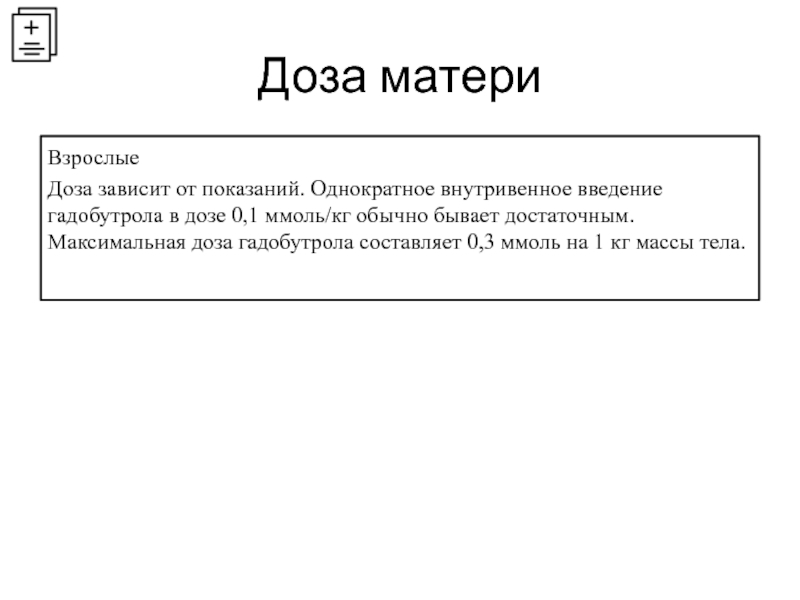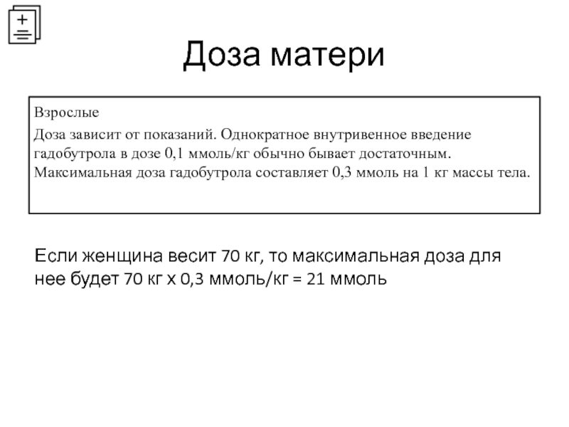 Если женщина весит 70 кг, то максимальная доза для нее будет 70 кг х 0,3 ммоль/кг = 21 ммоль