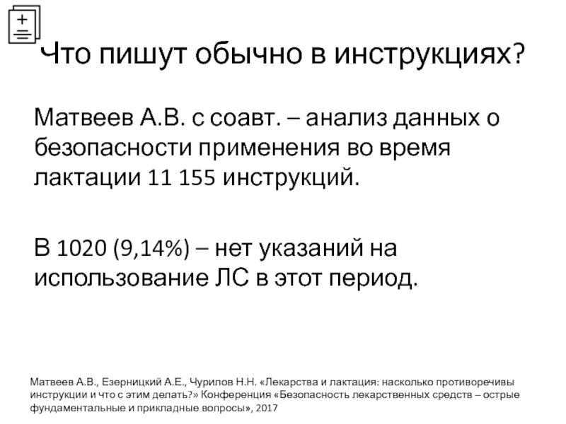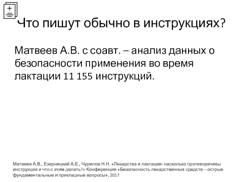 Матвеев А.В., Езерницкий А.Е., Чурилов Н.Н. «Лекарства и лактация: насколько противоречивы инструкции и что с этим делать?» Конференция «Безопасность лекарственных средств – острые фундаментальные и прикладные вопросы», 2017
