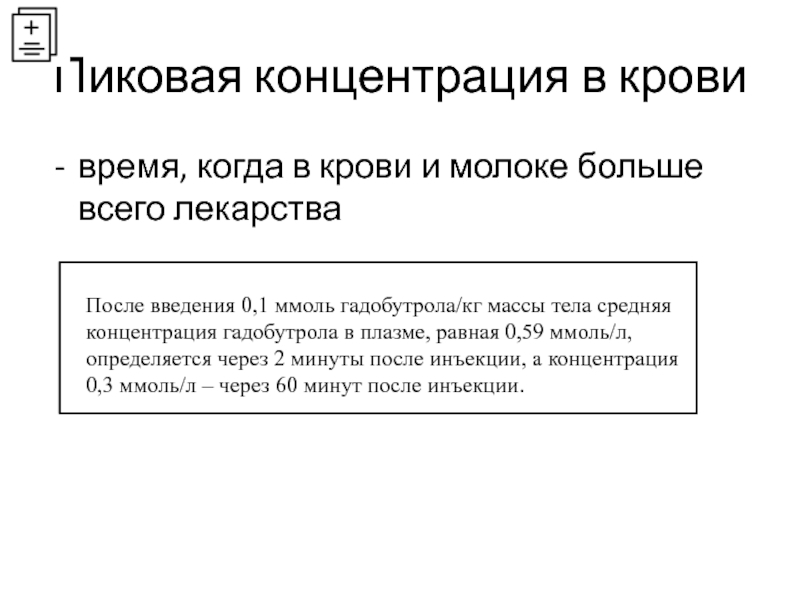 После введения 0,1 ммоль гадобутрола/кг массы тела средняя концентрация гадобутрола в плазме, равная 0,59 ммоль/л, определяется через 2 минуты после инъекции, а концентрация 0,3 ммоль/л – через 60 минут после инъекции.