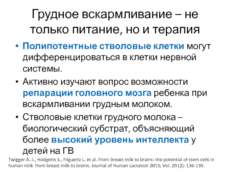 Twigger A.-J., Hodgetts S., Filgueira L. et al. From breast milk to brains: the potential of stem cells in human milk from breast milk to brains. Journal of Human Lactation 2013; Vol. 29 (2): 136-139.
