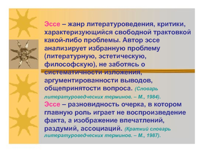 Слайд 3Эссе – жанр литературоведения, критики, характеризующийся свободной трактовкой какой-либо проблемы. Автор