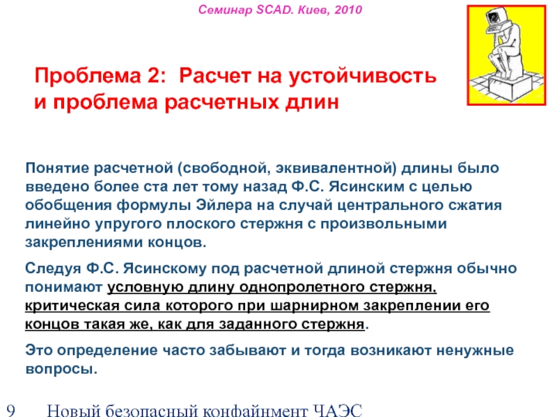 Понятие расчетной (свободной, эквивалентной) длины было введено более ста лет тому назад Ф.С. Ясинским с целью обобщения формулы Эйлера на случай центрального сжатия линейно упругого плоского стержня с произвольными закреплениями концов.