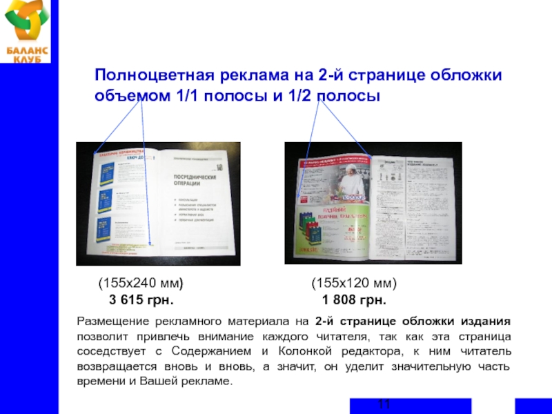 4-я полоса обложки – самый эффективный вид рекламы в бухгалтерских изданиях. Лицевая сторона обложки нередко является «рабочей» (на ней фиксируются основные темы, интересные для читателя). А 4-я полоса обложки берет на себя выполнение удовлетворения эстетических запросов аудитории.