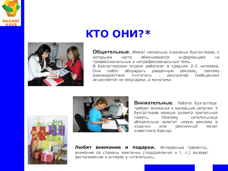 Внимательные. Работа бухгалтера требует внимания к малейшим деталям. У бухгалтеров хорошо развита зрительная память. Поэтому читательница обязательно заметит новую рекламу в издании или рекламный макет известного бренда.