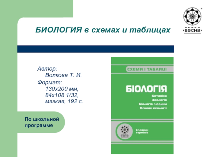 — общей биологии, биологии растений, животных, человека, биологии клетки, экологии, генетики — по всей школьной программе. Материал подан в таблицах и схемах, которые отображают структуру биологической науки, биологическую семантику, особенности организмов, строение и функции тканей, органов и др., акцентируя лишь основные положения, термины, составляющие, что позволяет использовать пособие для широкого обновления и закрепления изученного материала.