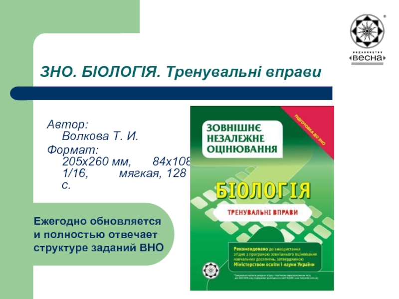 итоговой аттестации по биологии в основной та старшей школе, внешнему независимому оцениванию по биологии, обновить знания по всем курсам школьной биологии всем потенциальным абитуриентам высших учебных заведений.