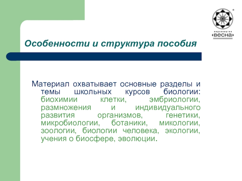 Материал пособия охватывает основные разделы и темы школьных курсов биологии: биохимии клетки, эмбриологии, размножения и индивидуального развития организмов, генетики, микробиологии, ботаники, микологии, зоологии, биологии человека, экологии, учения о биосфере, эволюции.