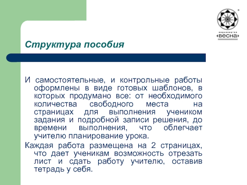 в которых продумано все: от необходимого количества свободного места на страницах для выполнения учеником задания и подробной записи решения, до времени выполнения, что облегчает учителю планирование урока.