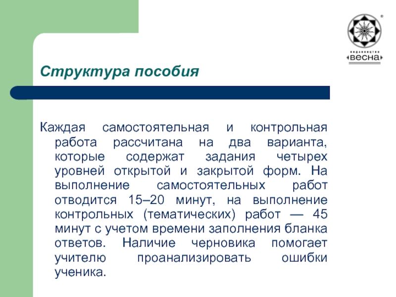 которые содержат задания четырех уровней открытой и закрытой форм. На выполнение самостоятельных работ отводится 15–20 минут, на выполнение контрольных (тематических) работ — 45 минут с учетом времени заполнения бланка ответов. Наличие черновика помогает учителю проанализировать ошибки ученика.