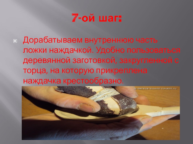 Дорабатываем внутреннюю часть ложки наждачкой. Удобно пользоваться деревянной заготовкой, закругленной