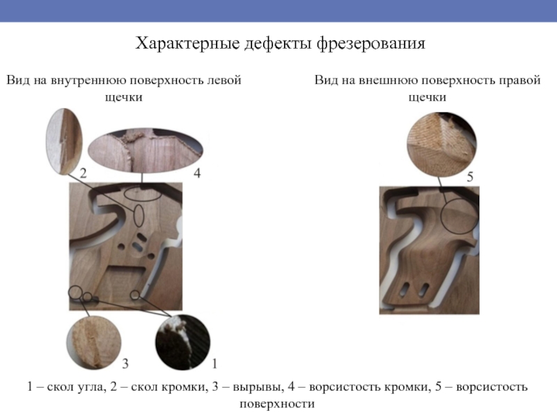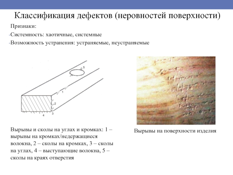 1 – скол угла, 2 – скол кромки, 3 – вырывы, 4 – ворсистость кромки, 5 – ворсистость поверхности