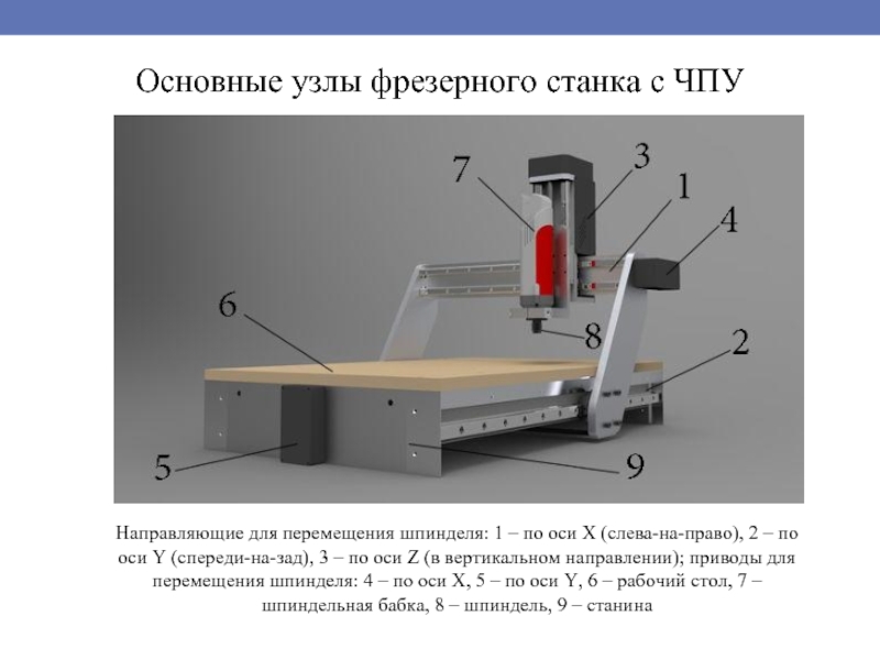 4 – шпиндель, 5 – колонна, 6 – дверца кожуха, 7 – защитный кожух, 8 – магазин инструментов, 9 – стойка ЧПУ (пульт управления), 10 – портал станка